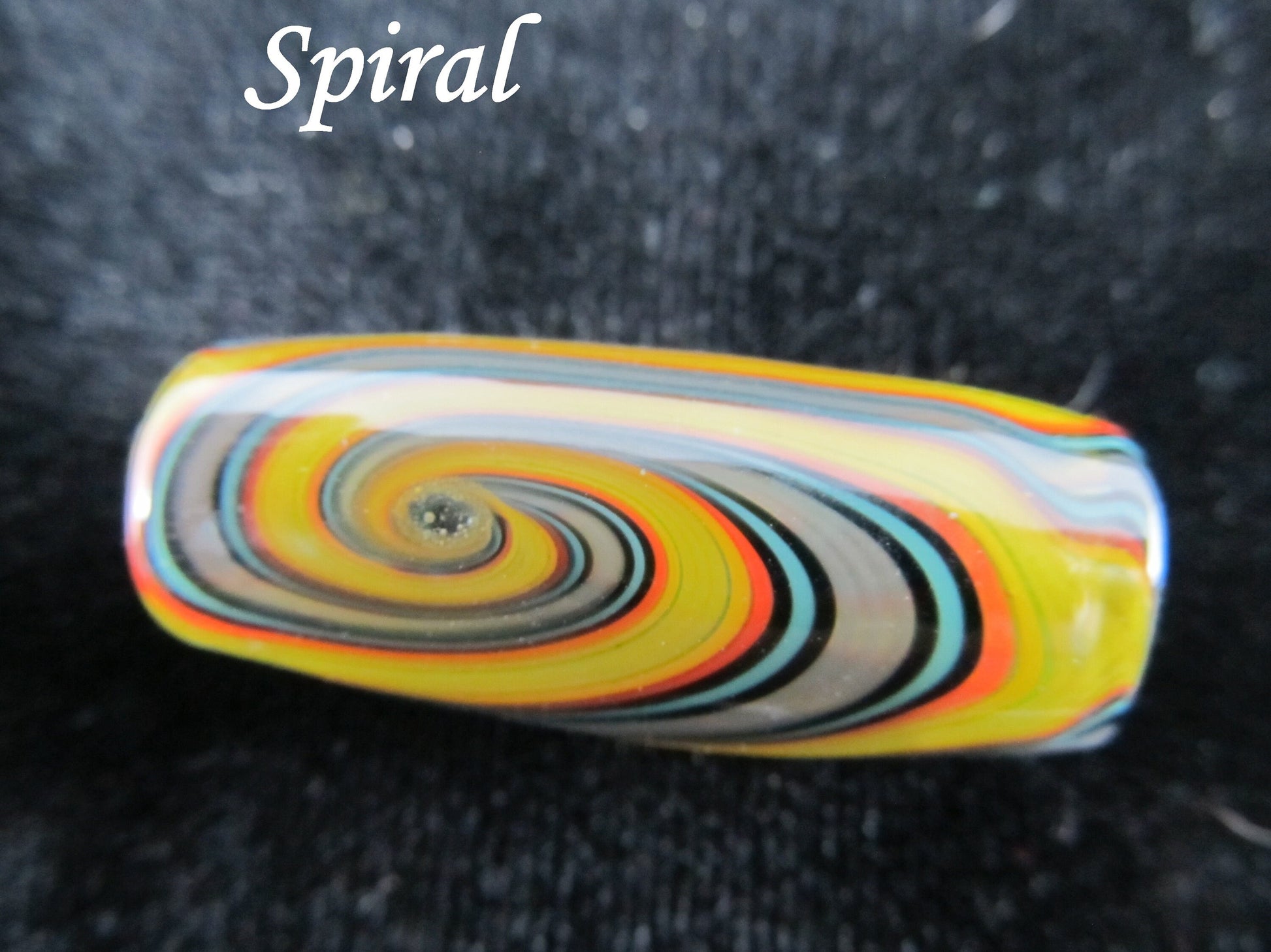 Reversed axis spiral, you can spot a reverse axis by two spirals on the front and back of the piece. The design is built horizontally on a blow tube, a hole is then popped off the side and a new blow tube is attached. Next the old blow tube is taken off and the whole thing is re-melted and shaped which reverses the axis and makes the design vertical. Essentially the design is melted and shaped twice.