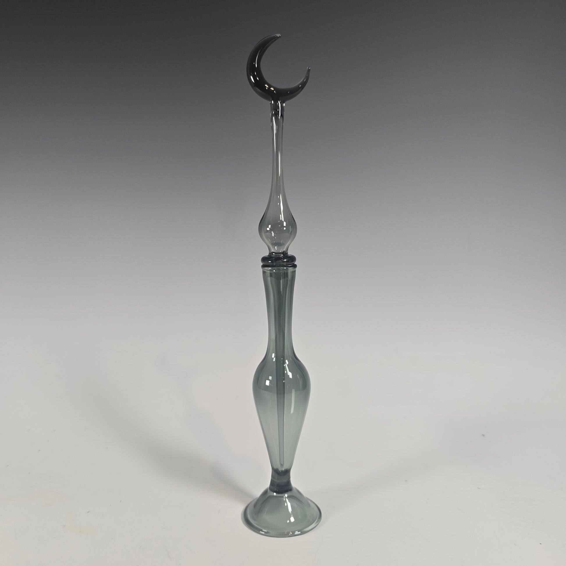 Each bottle is handblown from high-quality borosilicate glass and carefully crafted by artist Alyssa Miller in Bremerton, Washington. The beautiful, dark blue bottle is adorned with silver flake in the shape of a mesmerizing moon, hand sculpted to perfection. The custom color of cobalt blue and silver swirls create a stunning and unique design, with a hollow blown stopper that matches the intricate details on the bottle. Even the foot of the bottle is hand blown, adding to the overall aesthetic and making this an exceptional piece to display. Not only is this bottle a work of art, but it also functions as a perfume bottle, able to hold your favorite scent within its elegantly crafted walls.