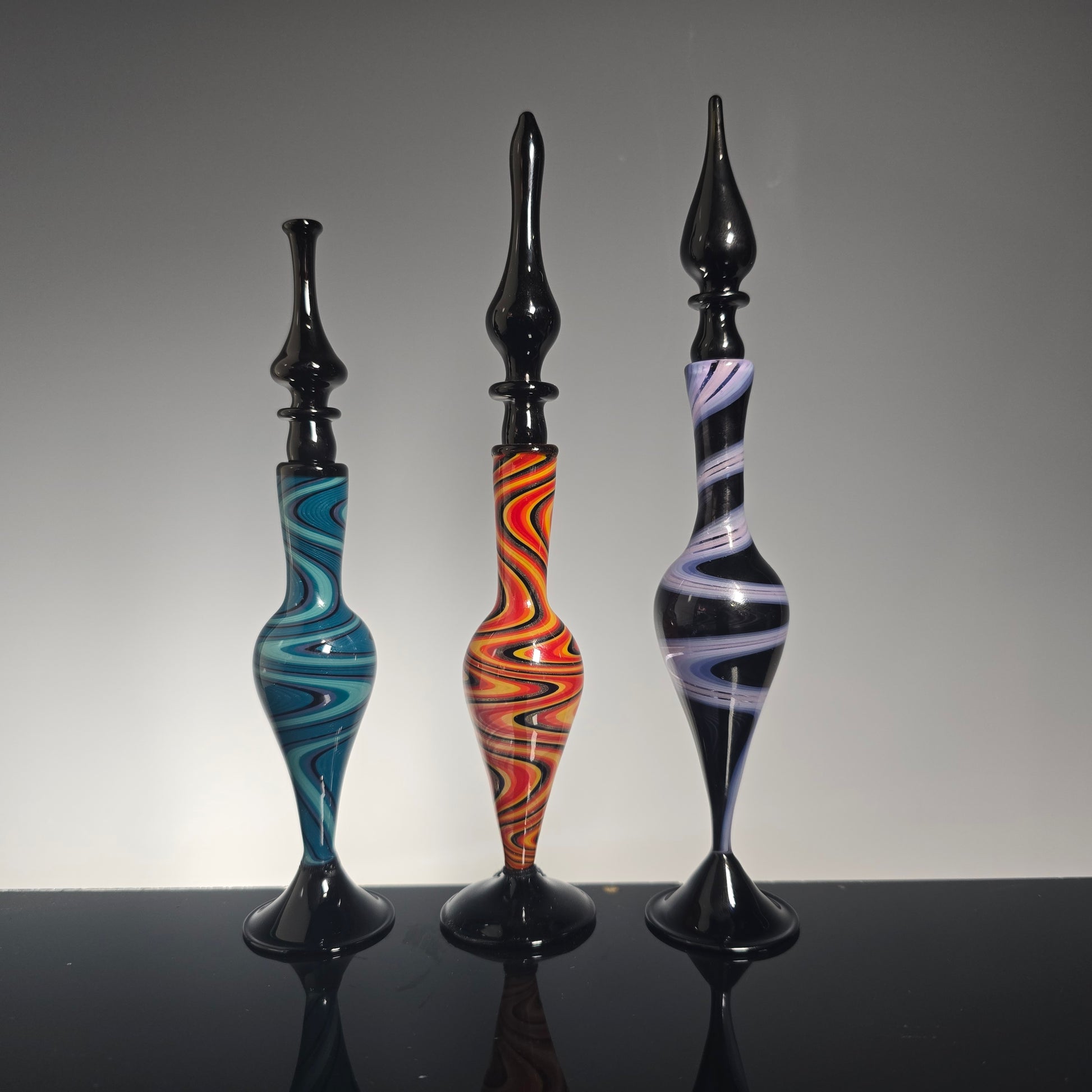 Elevate your magic with this hand blown glass perfume bottle, crafted for those who love witchy aesthetics, fantasy flair, and enchanting Ren Faire vibes. Each bottle is individually shaped in the flame, creating a one-of-a-kind vessel perfect for holding perfume, essential oils, ritual blends, or magical potions.