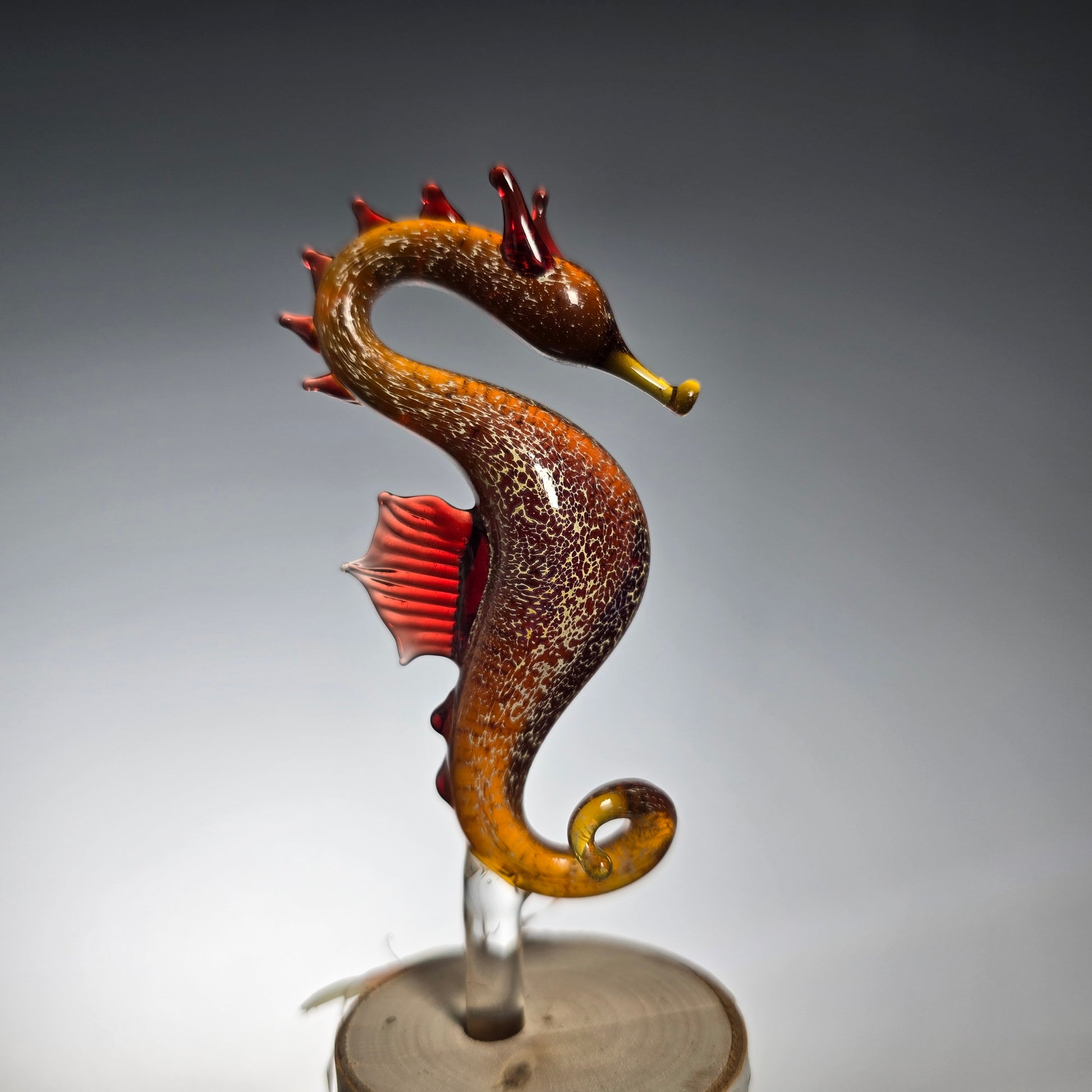 Adorable seahorse sculpture sits atop a burch log. 5-6 inches tall.