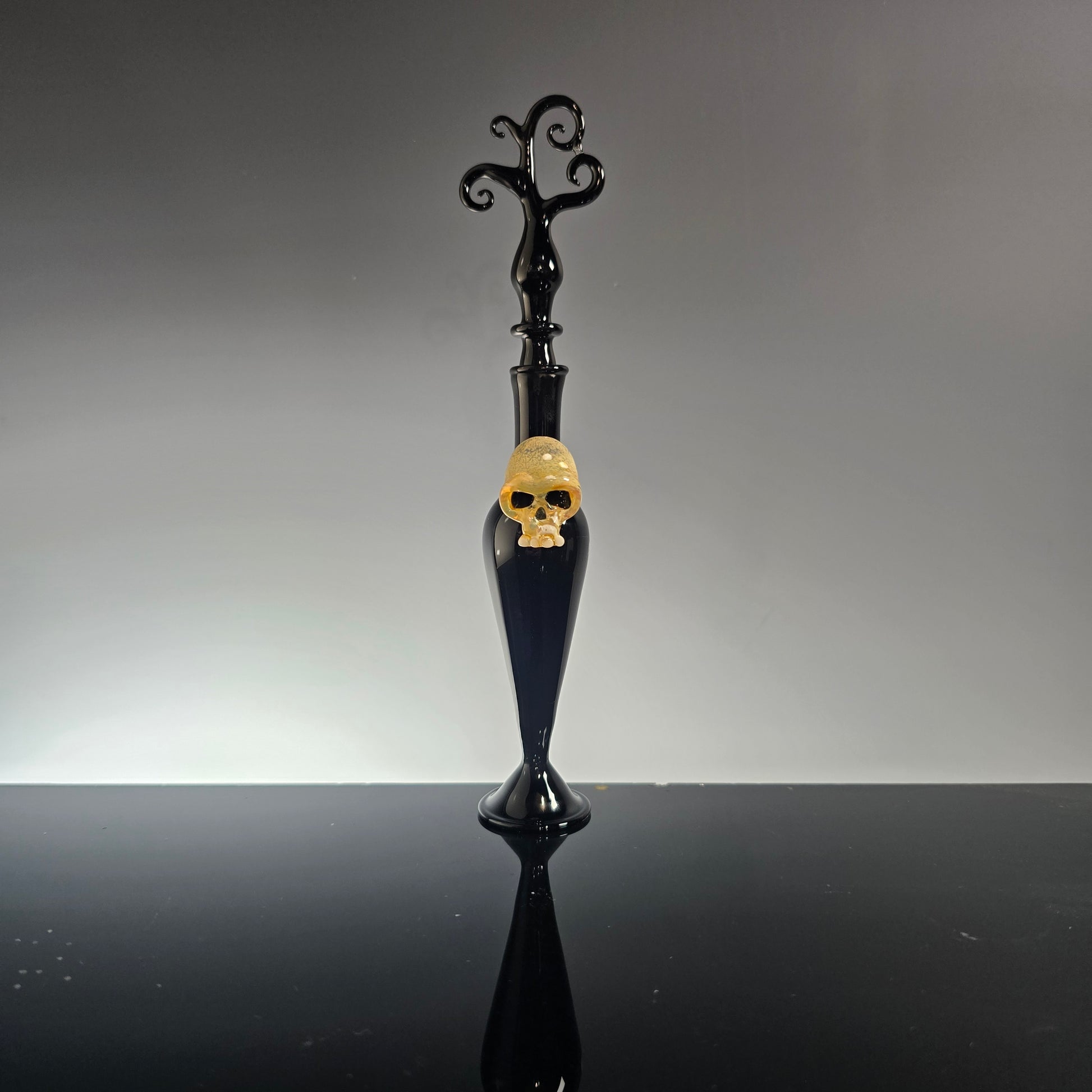This eerie-elegant hand-blown perfume bottle is made from durable borosilicate glass, featuring a sleek black body and a golden skull detail. The long, twisted stopper adds a hauntingly beautiful touch — perfect for gothic décor lovers, witchy vanities, or Halloween displays.